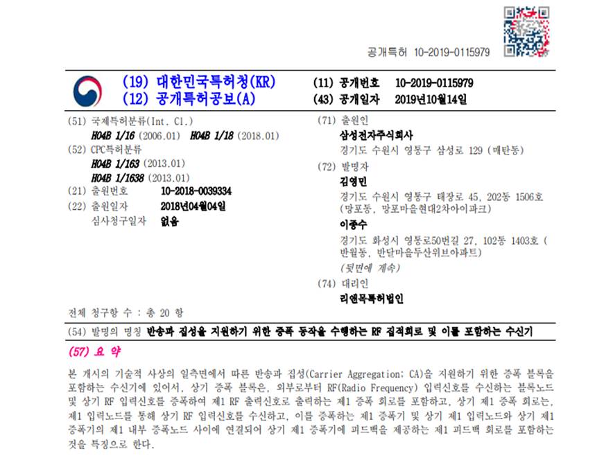 韓國專利公開文獻格式為[類別代碼:10]+[西元申請年份]+[七碼申請序列號]。因此,韓國專利公開號可以表示為10-YYYY-SSSSSSS。如圖7-1專利公開文獻範例中所示的欄位(11)공개번호 10-2019-0115979即為本文獻的公開號。