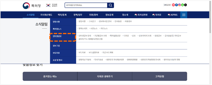 (2)進入韓文版韓國智慧財產局官網(網址: https://www.kipo.go.kr/ko/MainApp.do)後,點選公告事項(소식알림)[如圖 7-11],會顯示下拉選單[如圖7-12]然後再點選網路公告(인터넷공보),會出現選單然後可以點選「專利.實用新型(특허.실용신안)」、「設計(디자인)」、「商標(상표)」、「商標圖片檢索(상표이미지조회)」、以及「更正公告(정정공보)」等[如圖7-13],均會出現韓國檢索系統KIPRIS(網址:http://www.kipris.or.kr/)的網址[如圖7-14至圖7-18]。然後進入韓國檢索系統KIPRIS官方網頁[如圖7-19]。點選官方網頁右上方切換成英文介面的按鈕後,即可切換為英文介面 [如圖7-20]。