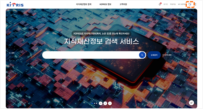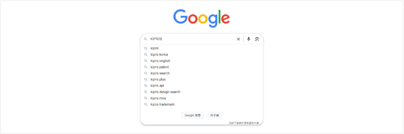 (1)從Google搜尋「KIPRIS[如圖7-7]」,會顯示搜尋結果[如圖7-8],然後點選網址進入韓國檢索系統KIPRIS韓文網頁(網址: https://www.kipris.or.kr/khome/main.do )[如圖7-9],點選官方網頁右上方切換成英文介面的按鈕後,即可切換為英文介面 [如圖7-10]。