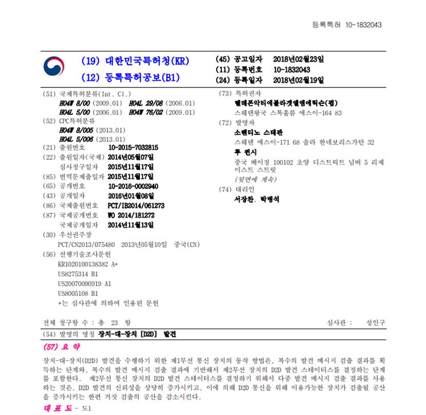 韓國專利公告文獻格式為[類別代碼:10] +[七碼申請序列號],在一些資料庫中又會以[類別代碼:10] +[七碼申請序列號]+[四碼0]。因此,韓國專利公告號可以表示為10-SSSSSSS或是10-SSSSSSS-0000>。如圖7-2專利公告文獻範例中所示的欄位(11등록번호 10-1832043即為本文獻的公告號。