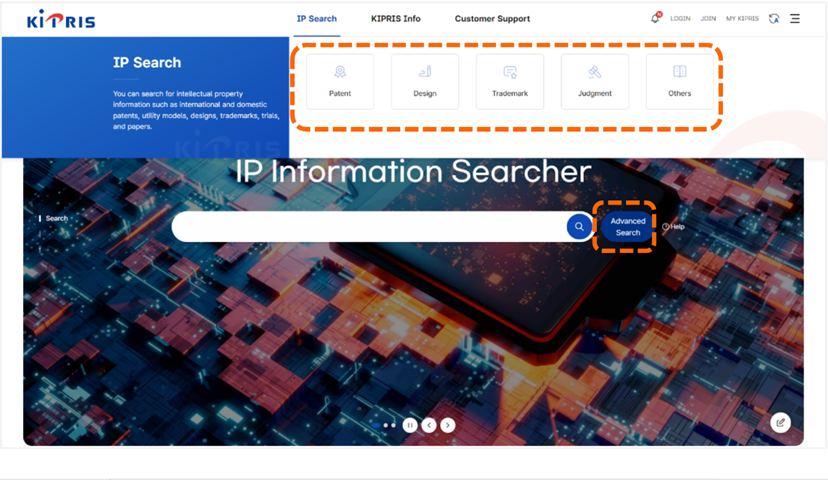 從韓國檢索系統KIPRIS首頁點選「Advanced Search」,進入檢索頁面[如圖7-65]。