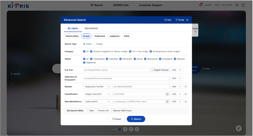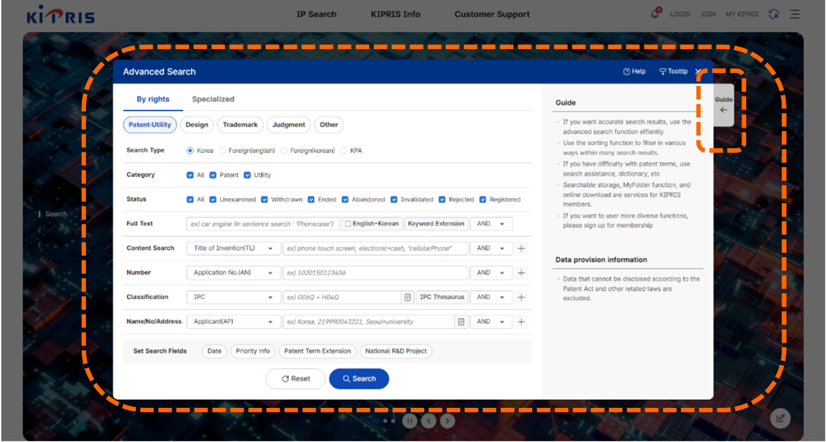 以下將以切換成英文介面的韓國檢索系統KIPRIS網頁進行操作介紹。如圖7-21所示,主頁中央正上方點選「IP Search」選項後有五種檢索類型可以點選,分別為「Patent(專利)」、「Design(設計)」、「Trademark(商標)」、「Judgment(判決)」、以及「Other(其他)」五種類別可以選擇。當我們在點選「Advanced Search」後,可以選擇想要的檢索條件進行檢索,而點選Guide選項會提供檢索系統導引[如圖7-22]。