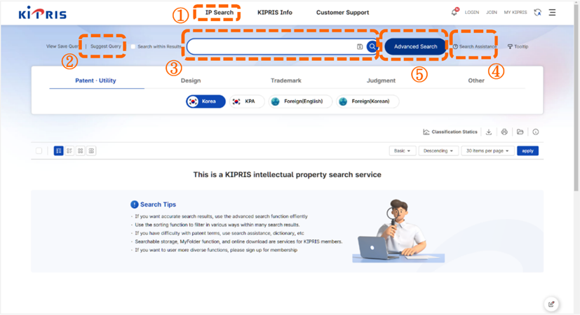 標號①:點選上方選項「IP Search」,可以選擇檢索類別[如圖7-23]。標號②,點選「Suggest Query」後會彈出視窗可以勾選分類號(IPC、CPC、韓文分類、產品分類)、分類編號(A~H、A~H、A~N、)、檢索條件,再進行檢索。標號③,可以輸入欲檢索的條件。標號④,檢索協助。標號⑤,點選「Advanced Search」。
