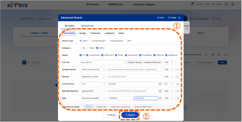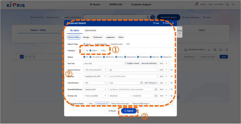 從韓國檢索系統KIPRIS首頁點選「Advanced Search 」,進入檢索頁面[如圖7-41]。標號①,當我們要檢索實用新型文獻時,我們可以在「Category」欄位將點掉專利只勾選實用新型。