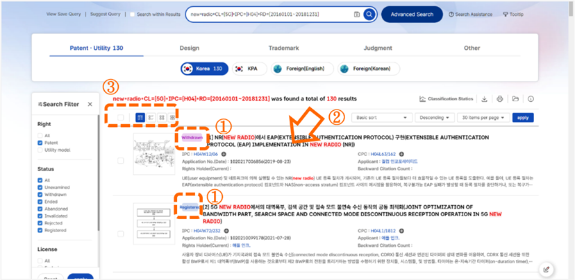 點選「Search」後,出現130筆結果[如圖7-25]。標號①,可以看到各個案件的目前狀態。標號②,點選第1筆結果的標題後會將畫面分割成兩個區塊。左方區塊會列出檢索結果;右方區塊會列出第1筆檢索結果的詳細資訊。標號③,點選此處的選項可以切換檢索結果的顯示方式。