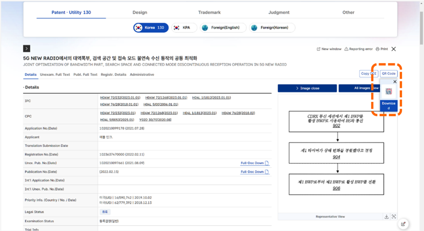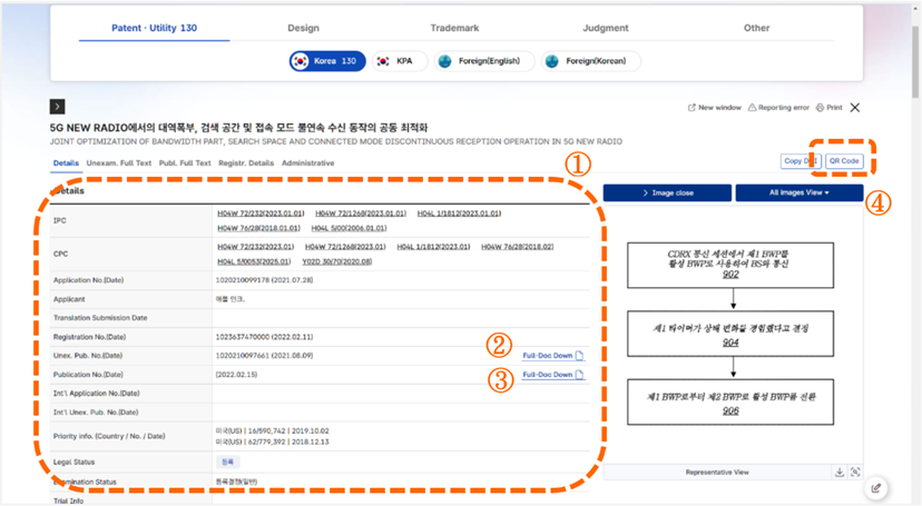 當我們選擇查閱第2筆檢索結果時,點選分割視窗的淺灰色按鈕可以調整成只顯示此筆檢索結果的視窗[如圖7-26]。標號①,此案件的詳細資訊。標號②,Unex. Pub. No.(Date)欄位中點選Full-Doc Dow可以下載公開案PDF檔案。標號③,Publication No.(Date)欄位中點選Full-Doc Dow可以下載公告案PDF檔案。標號④,點選QR code選項,會出現此筆案件的QR code。點選QR code或是點選Download選項即可下載QR code圖像,供我們掃瞄QR code,便可連上本件案件查閱詳細資訊[如圖7-27]。
