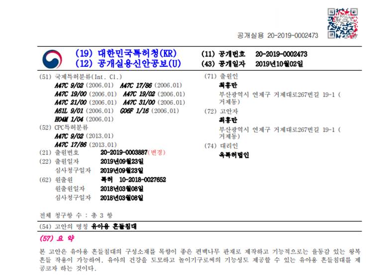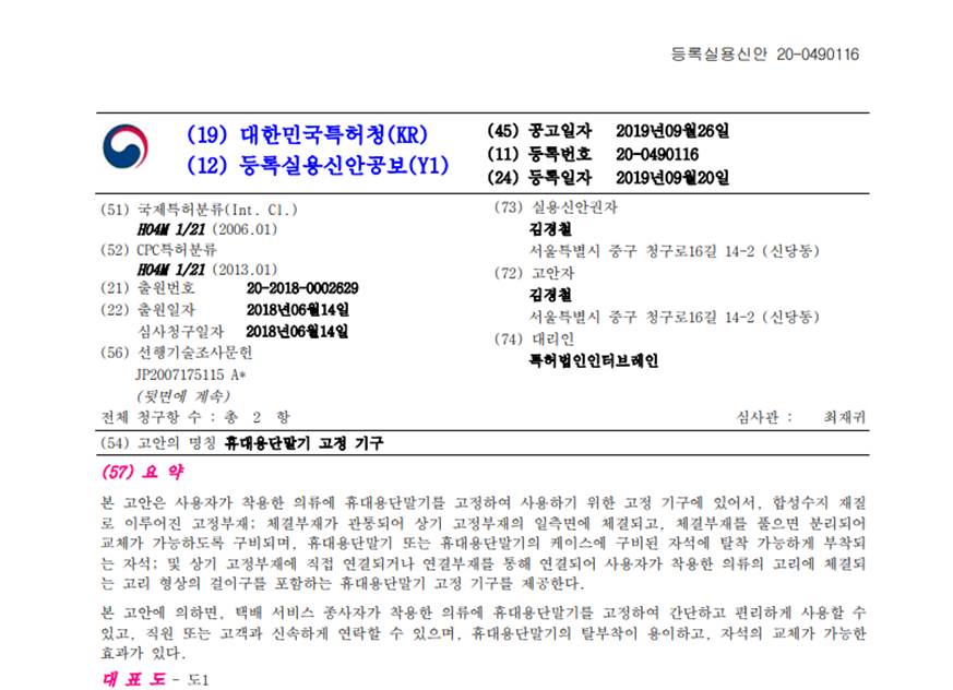 韓國實用新型公開號的格式為[類別代碼:20]+[西元申請年份]+[七碼申請序列號]。因此,韓國實用新型公開號可以表示為20-YYYY-SSSSSSS。如圖7-3實用新型公開文獻範例中所示的欄位(11)공개실용 20-2019-0002473即為本文獻的公開號。