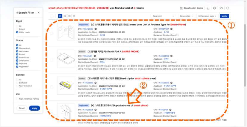 在點選「Search」後,會出現6筆實用新型檢索結果[如圖7-43]。標號①,可以看到案件的狀態。標號②,點選第4筆結果的標題後會將畫面分割成兩個區塊。左方區塊會列出檢索結果;右方區塊會列出第4筆檢索結果的詳細資訊。