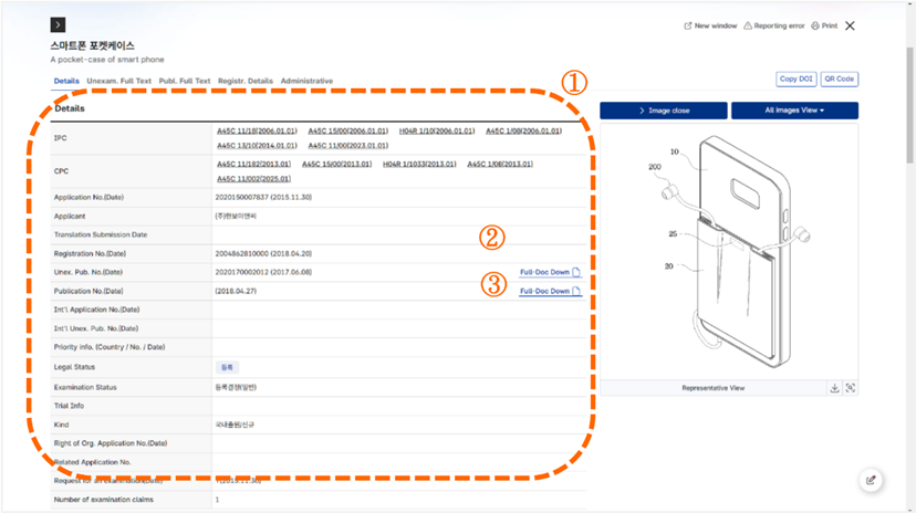 當我們選擇查閱第4筆檢索結果時,點選分割視窗的淺灰色按鈕可以調整成只顯示此筆檢索結果的視窗 [如圖7-44]。標號①,此案件的詳細資訊。標號②,Unex. Pub. No.(Date)欄位中點選Full-Doc Dow可以下載公開案PDF檔案。標號③,Publication No.(Date)欄位中點選Full-Doc Dow可以下載公告案PDF檔案。