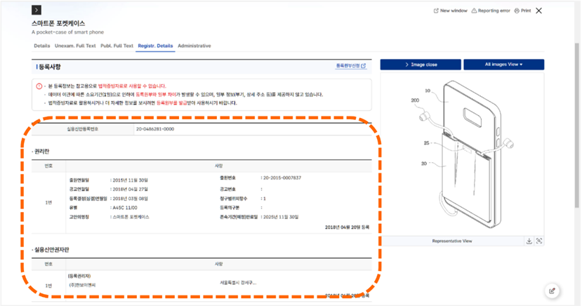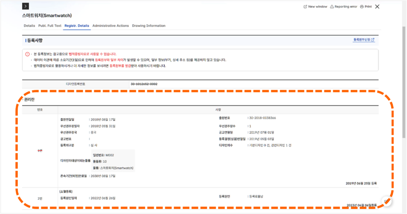 當案件經註冊後系統會出現「Registr. Details」選項。點選「Registr. Details」後,會列出案件公告的詳細資訊以及專利持有人資訊[如圖7-38]。