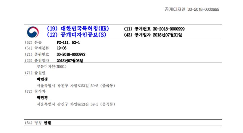 韓國設計公開號的格式為[類別代碼:30]+[西元申請年份]+[七碼申請序列號],因此,韓國設計申請號可以表示為30-YYYY-SSSSSSS。如圖7-5設計公開文獻範例中所示的欄位(11)출원번호 30-2018-0000999即為本文獻的公開號。