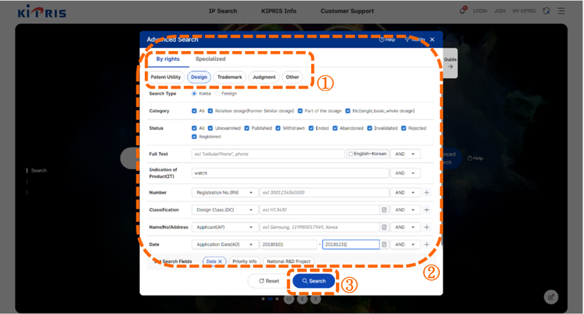 在點選「Advance Search」後,將會出現檢索選項選單[如圖7-53]。標號①,當我們要檢索設計文獻時,我們可以從「By rights」欄位勾選「Design」。標號②,輸入欲檢索的關鍵字。本次在Indication of Product(IT)欄位輸入「watch」以及點選下方「Set Search Fields」的Date後選擇Application Date(AD)後輸入「20180101」至「20181231」。標號③,點選「Search」進行檢索。
