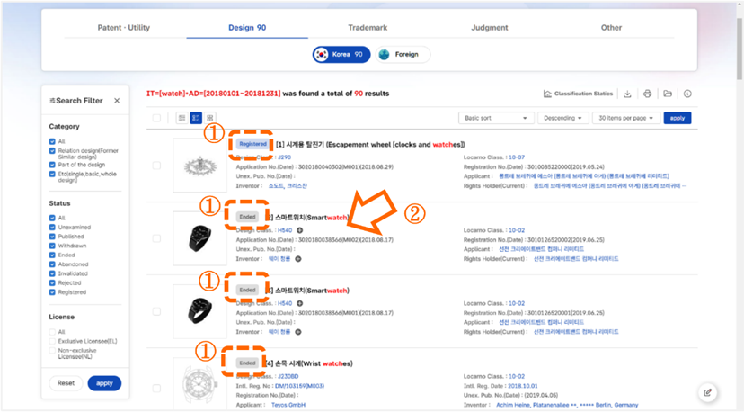 在點選「Search」後,會出現90筆設計公開文獻的資訊[如圖7-54]。標號①,可以看到案件目前的審查狀態。標號②,點選第2筆結果的標題後會將畫面分割成兩個區塊。左方區塊會列出檢索結果;右方區塊會列出第2筆檢索結果的詳細資訊。