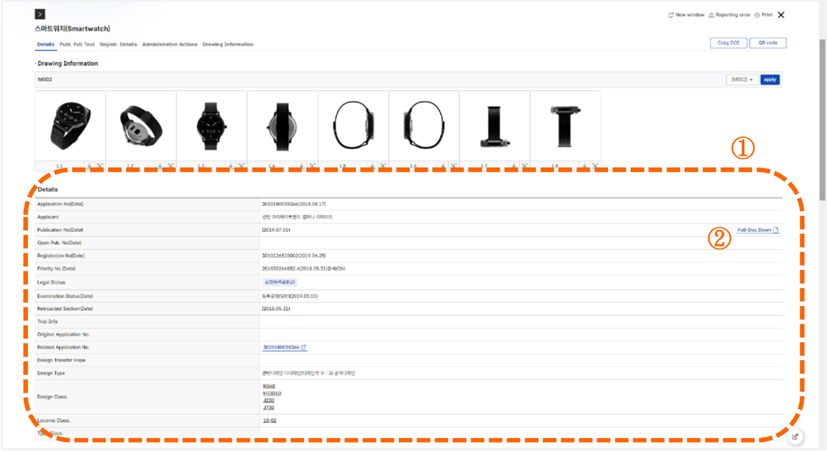 當我們選擇查閱第2筆檢索結果時,點選分割視窗的淺灰色按鈕可以調整成只顯示此筆檢索結果的視窗 [如圖7-55]。標號①,此案件的詳細資訊。標號②,Publication No(Date)欄位中點選Full-Doc Dow可以下載設計公開案PDF檔案。
