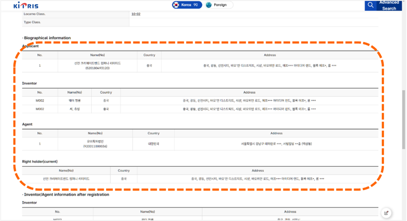 下拉視窗到Biographical information欄位時,會分別列出申請人資訊、發明人資訊、代理人資訊以及目前權利持有者資訊 [如圖7-56]。