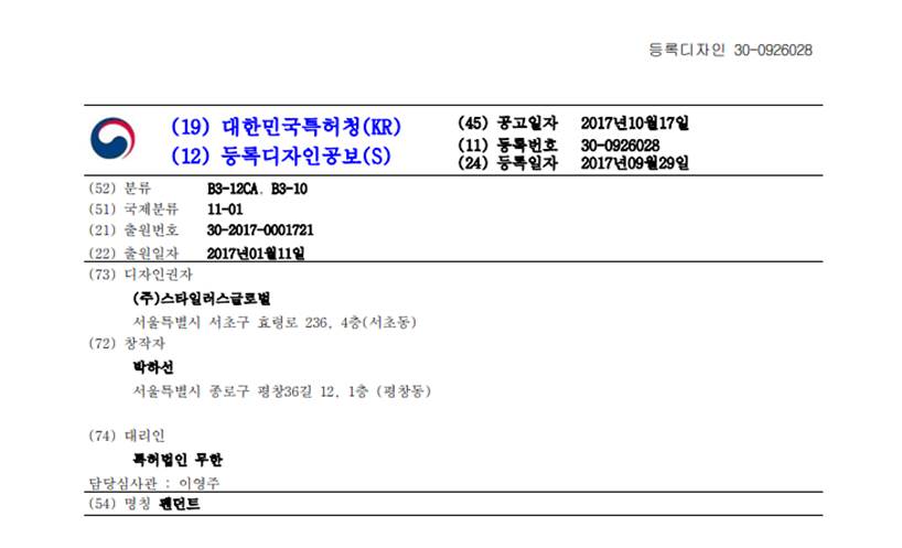 韓國設計公告文獻格式為[類別代碼:30] +[七碼申請序列號],在一些資料庫中又會以[類別代碼:30] +[七碼申請序列號]+[四碼0]來表示。因此,韓國設計公告號可以表示為30-SSSSSSS或是30-SSSSSSS-0000。如圖7-6設計公告文獻範例中所示的欄位(11)등록번호 30-0926028即為本文獻的公告號。