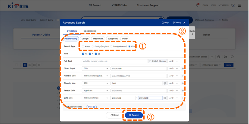 在點選「Advance Search」後,將會出現檢索選項選單[如圖7-66]。標號①,當我們要檢索KPA專利文獻時,我們可以從「Search Type」欄位勾選「KPA」。標號②,輸入欲檢索的關鍵字。本次在IPC欄位輸入「G06」、「Direct Input」欄位中選擇Title輸入「blockchain」以及點選下方Set Search Fields的Priority info後選擇Publication Date輸入「20240101」至「20250131」。標號③,點選「Search」進行檢索。