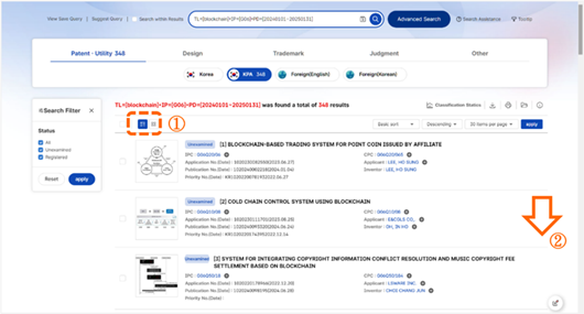 在按下「Search」後,會出現348筆公開和公告註冊檢索結果[如圖7-67]。標號①,點選後可以切換檢索結果的顯示方式[如圖7-68]。標號②,下拉視窗點選第13筆結果的標題後會將畫面分割成兩個區塊。左方區塊會列出檢索結果;右方區塊會列出第13筆檢索結果的詳細資訊[如圖7-69]。
